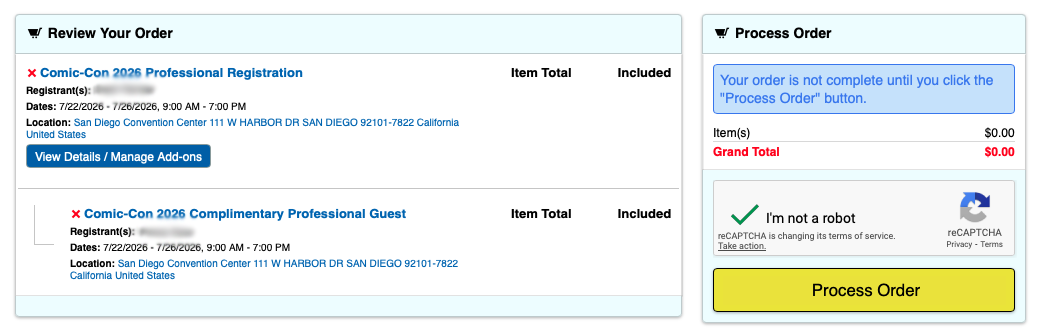 You are ready to check out! Ensure that all details shown are correct, then click “Process Order” to finalize your badge registration.