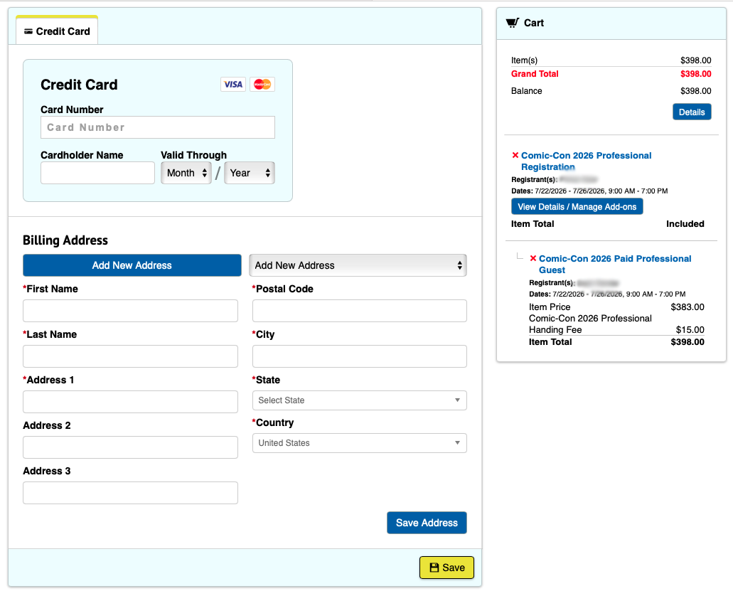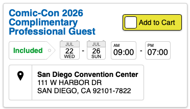 All badges registered by May 7, 2026, will be mailed to the “Primary Shipping Address” on file in the registering professional’s Comic-Con Member ID account. We are unable to ship to an international address. Badges registered after May 7, 2026, and badges with international addresses must be picked up on-site by the registering professional.