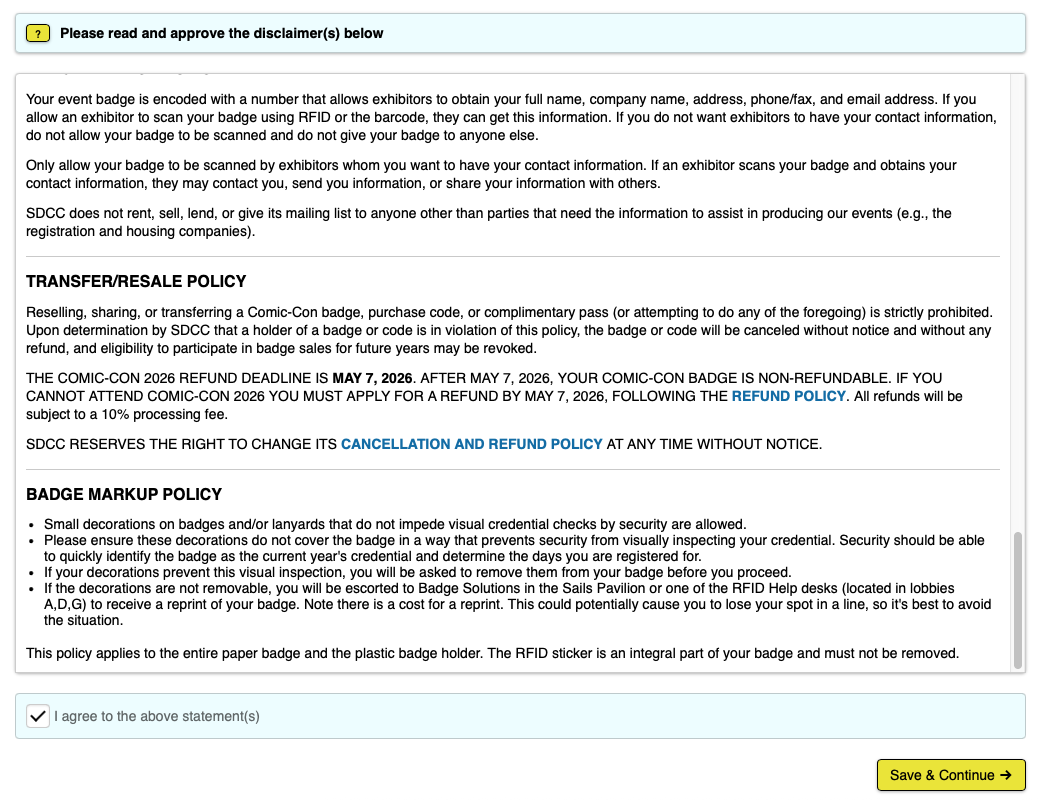 Carefully read our badge registration terms and conditions and health precautions policy. Select the “I agree to the above statement” checkbox, and then “Save & Continue.”