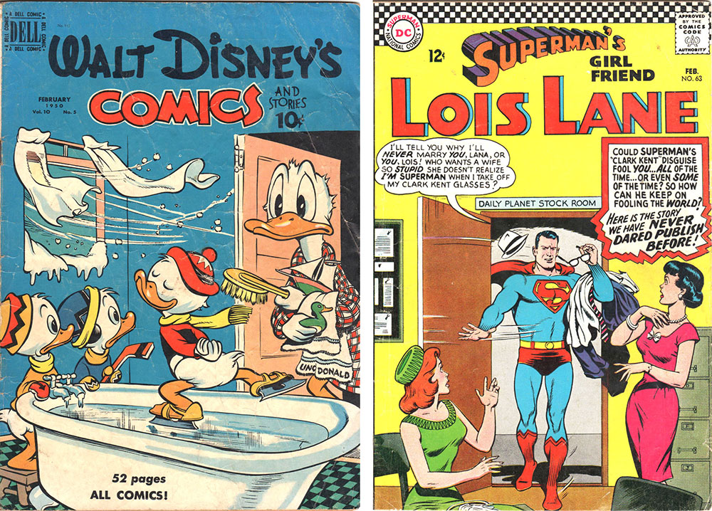 An entire focus of comics collectors has been on covers—to the point at which such covers used to be noted in “for sale” ads: Atom-bomb cover! Good Girl Art cover! Bondage cover! (I detect a theme in itself.) Probably my favorite “for sale” ad was from Smilin’ Ed Comics, designed by Raoul Vezina. It ran in Buyer’s Guide for Comic Fandom and was a full page of “Good Dog Comics” for sale. (Pluto on a leash was a “Dog Bondage” cover.)